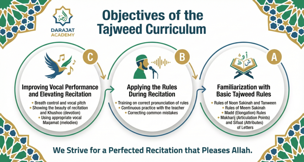 Teaching how to read the Holy Quran, correct recitation, and rules of tajweed, with continuous follow-up and a clear methodology that helps students master the skill step by step.